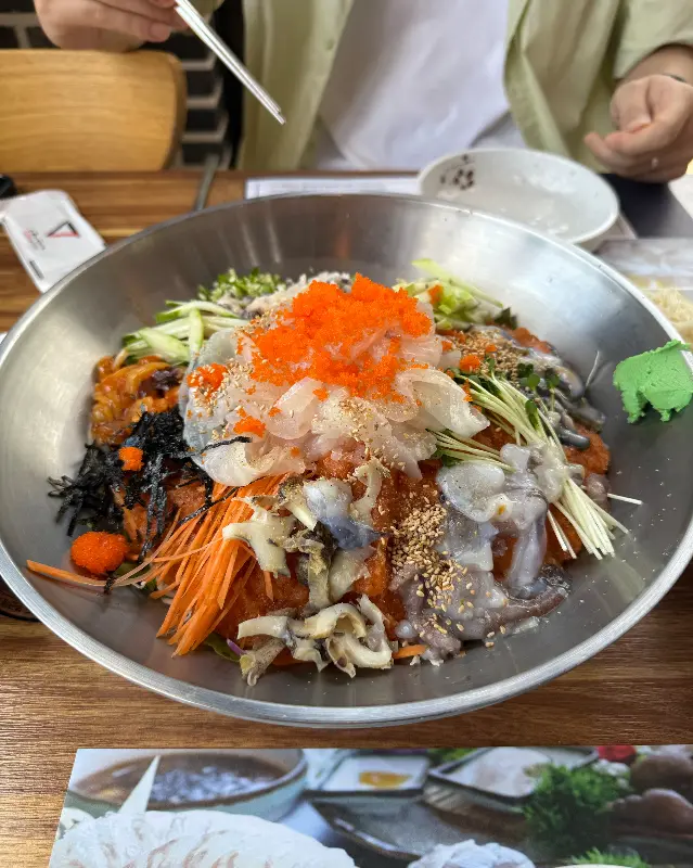 드디어, 기다리고 기다리던 ‘해물 물회’가 등장했다. 거대한 스테인리스 그릇에 담긴 물회는 시각적인 압도감부터 남달랐다. 붉은색 양념 육수 위에 싱싱한 해산물과 채소가 듬뿍 올려져 있었는데, 그 색감의 조화가 마치 잘 조율된 스펙트럼처럼 느껴졌다.