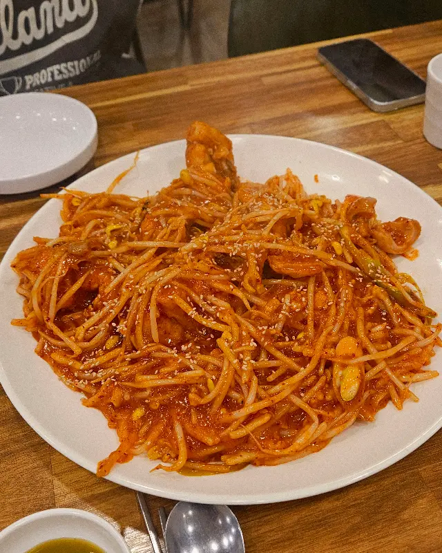 콩나물은 아삭한 식감이 일품이었다. 세포벽이 단단하게 유지되어 있어 씹을 때마다 신선함이 느껴졌다. 콩나물 특유의 시원한 맛은 아귀찜의 매운맛을 완화시켜주는 역할을 했다. 마치 완충 용액처럼, 입안의 pH 농도를 적절하게 유지시켜주는 듯했다.