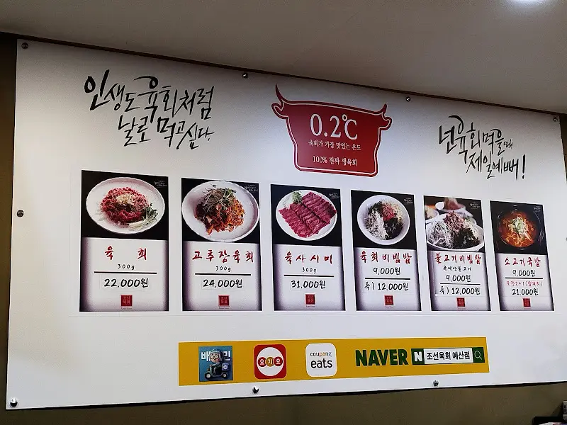 문을 열고 들어서자, 생각보다 넓고 깔끔한 공간이 눈에 들어왔다. 은은한 조명이 테이블 위를 비추고, 벽면에는 메뉴 사진들이 맛있게 진열되어 있었다. 특히 눈길을 사로잡는 건, “인생 육회처럼 날로 먹고 살자”라는 재치 있는 문구였다. 왠지 모르게 웃음이 났다. 오늘, 정말 제대로 된 부산 맛집을 찾아온 것 같다는 예감이 강하게 들었다.