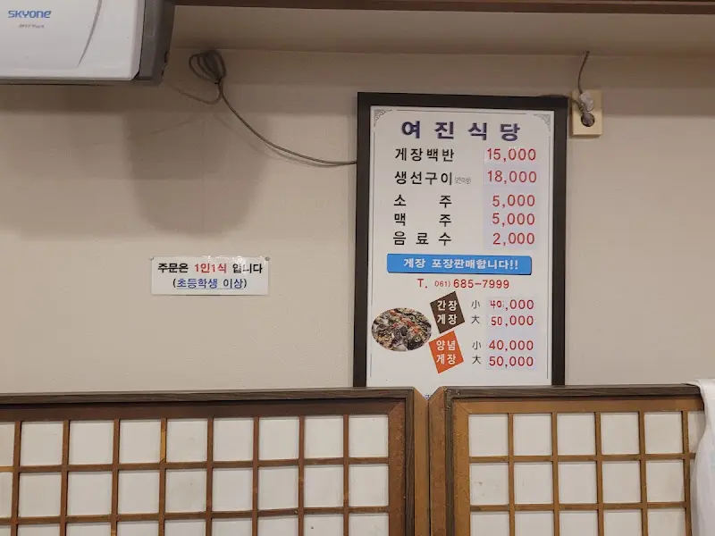 식당에 가까워질수록, 간판에서 풍겨져 나오는 노포의 아우라가 느껴졌다. 붉은 벽돌과 세월의 흔적이 느껴지는 외관, 그리고 간판에 그려진 게장의 이미지는 나의 기대감을 한층 더 고조시켰다. 건물 외벽에 붙어있는 “여진식당” 간판은 오랜시간 이 자리를 지켜온 듯한 모습이었다 . 마치 잘 숙성된 김치처럼, 깊은 맛을 품고 있을 것 같은 느낌이랄까. 서둘러 문을 열고 식당 안으로 들어섰다.