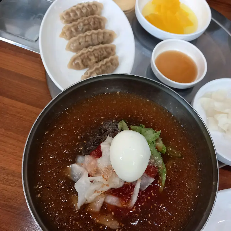 식당 문을 열자, 후각 수용체를 자극하는 은은한 육수 향이 코끝을 간지럽혔습니다. 마치 실험실에 들어선 과학자처럼, 기대감과 설렘이 교차하는 순간이었죠. 테이블에 앉아 메뉴를 스캔하니, 물냉면, 비빔냉면, 손만두, 석쇠불고기 등 다양한 선택지가 눈에 들어왔습니다. 잠시 고민했지만, 데이터가 이미 최적의 조합을 제시했으니, 물비빔냉면과 손만두를 주문하기로 결정했습니다.