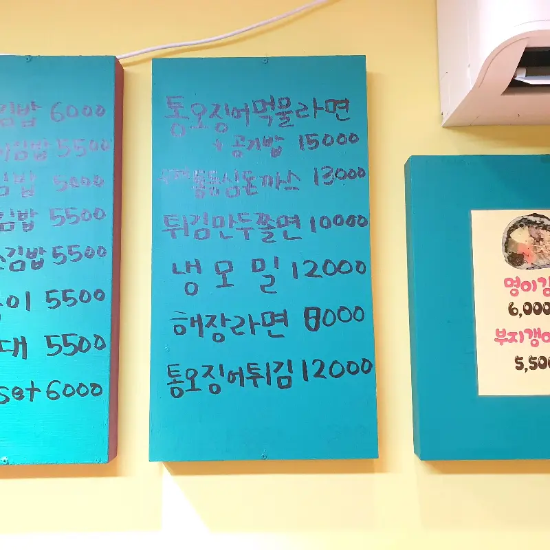 메뉴판을 스캔하며 어떤 실험을 진행할지 고민에 빠졌다. 김밥, 라면, 돈가스, 떡볶이… 다양한 메뉴들이 나의 탐구욕을 자극했다. 특히 눈에 띈 것은 ‘통오징어먹물라면’. 울릉도에서 갓 잡아 올린 싱싱한 오징어의 풍미와 먹물의 깊은 맛이 어우러진다는 설명을 보니, 이 메뉴는 반드시 실험해봐야겠다는 확신이 들었다. 더불어, 독도스낵의 대표 메뉴라는 김밥도 빼놓을 수 없지. ‘명이나물김밥’과 ‘부지깽이김밥’이라는 독특한 이름은, 울릉도에서만 맛볼 수 있는 특별한 풍미를 기대하게 만들었다.
