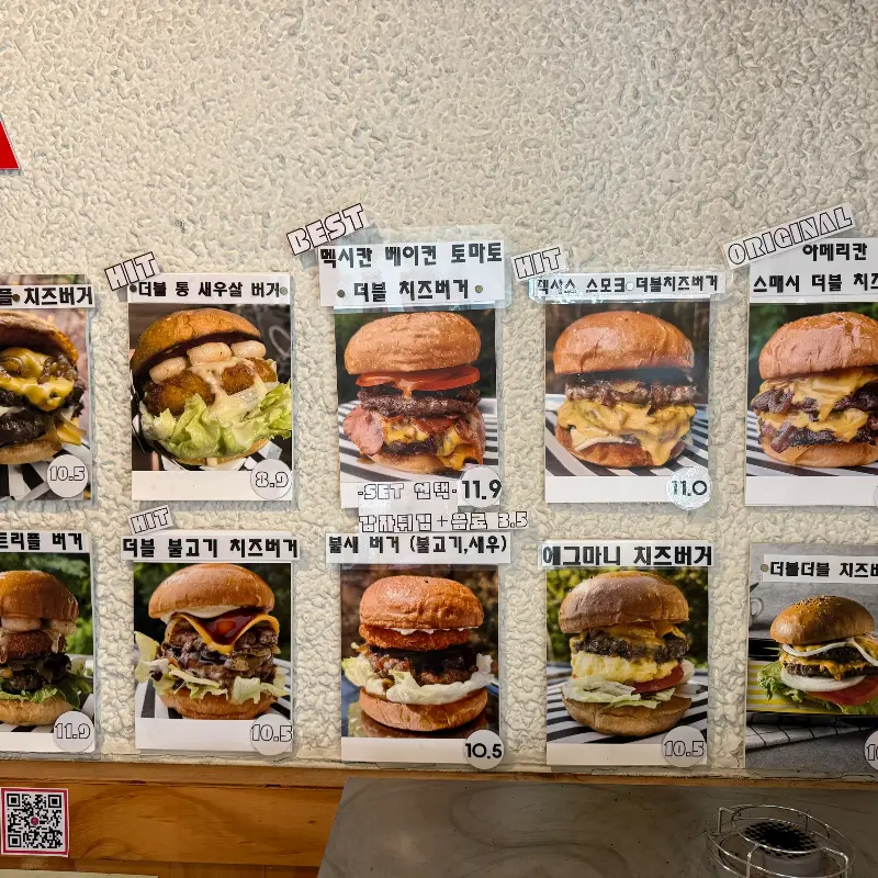 다양한 수제 버거 메뉴 사진이 걸린 벽면