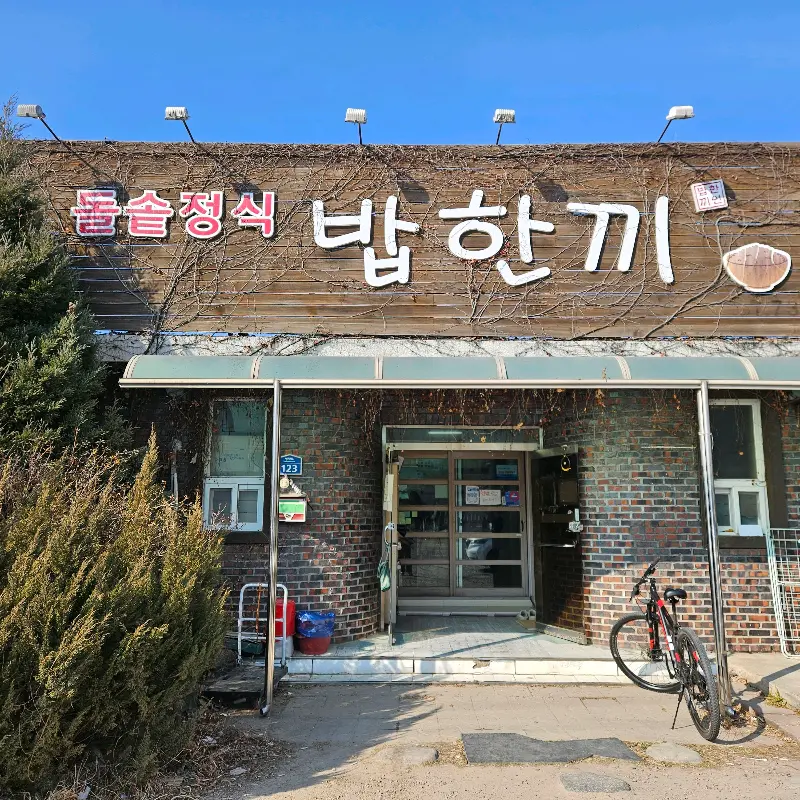 굽이굽이 이어진 한적한 시골길을 따라 들어가니, 드디어 목적지인 ‘밥한끼’가 눈에 들어왔다. 담쟁이 덩굴이 멋스럽게 휘감은 벽돌 건물은 세월의 흔적을 고스란히 간직하고 있었지만, 어딘지 모르게 따뜻하고 정겨운 분위기를 풍겼다. 간판에는 큼지막하게 ‘돌솥정식 밥한끼’라고 적혀 있었고, 그 옆에는 소박한 조개 그림이 그려져 있었다. 마치 오랜 친구 집에 놀러 온 듯한 편안함이 느껴졌다.