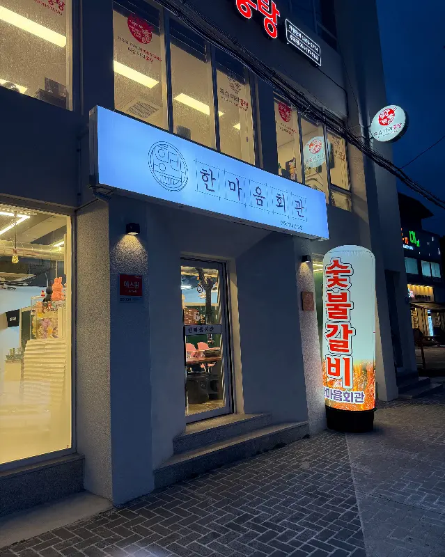 후포항에 가까워질수록 짭짤한 바다 냄새가 코를 찌르는데, 와… 이거 진짜 힐링 그 자체! 드디어 한마음회관 간판이 눈에 들어왔다. 간판 옆에 큼지막하게 써 붙인 ‘숯불갈비’ 세 글자가 심장을 더욱 요동치게 만들었다. 둑흔둑흔…🤤