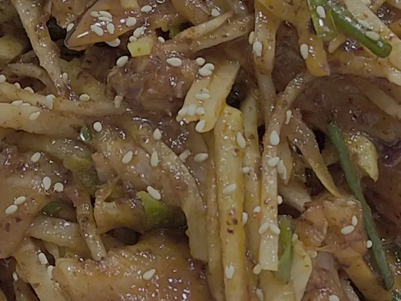 드디어 간재미무침이 등장했다. 사진에서 봤던 것보다 훨씬 푸짐한 양에 감탄했다. 접시를 가득 채운 간재미무침은, 붉은 양념과 하얀 간재미, 그리고 초록색 야채들이 조화롭게 어우러져 시각적으로도 훌륭했다. 마치 잘 설계된 분자 구조처럼, 색감의 균형이 완벽했다. 간재미는 먹기 좋게 손질되어 있었고, 양념은 겉돌지 않고 간재미와 완벽하게 혼합되어 있었다. 하얀 깨가 듬뿍 뿌려져 있는 모습은, 마치 과학 실험에 사용되는 시약처럼 신비로운 느낌마저 자아냈다.
