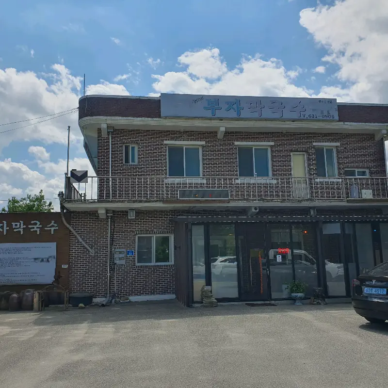 굽이굽이 산길을 따라, 정말 이런 곳에 식당이 있을까 싶은 의문이 들 때 즈음, 낡은 벽돌 건물이 눈에 들어왔다. 간판에는 정겹게 “부자막국수”라고 쓰여 있었다. 겉모습은 소박했지만, 왠지 모르게 깊은 내공이 느껴졌다. 넓은 주차장이 마련되어 있어 편하게 차를 세울 수 있었다. 주차를 마치고 내리니, 시원한 바닷바람이 땀방울을 식혀주며 기분 좋게 맞이해줬다.