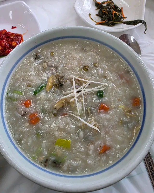 죽 안에는 바지락뿐만 아니라 녹두를 포함한 다양한 재료들이 들어 있어, 씹는 재미도 있었다. 특히 바지락은 쫄깃한 식감이 살아있었고, 신선함이 느껴졌다. 죽은 간이 세지 않아, 함께 나온 볶음김치나 오징어젓갈과 함께 먹으니 더욱 맛있었다.