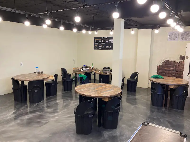 문을 열고 들어선 내부는 생각보다 넓고 테이블 간 간격도 넉넉했습니다. 천장에는 동그란 전구들이 줄지어 매달려 있어, 공간 전체에 따뜻하고 편안한 분위기를 더했습니다. 테이블은 둥근 형태로 되어 있었고, 의자는 등받이가 없는 검은색 플라스틱 의자였는데, 숯불을 피우기 위한 장치가 테이블마다 설치되어 있었습니다.