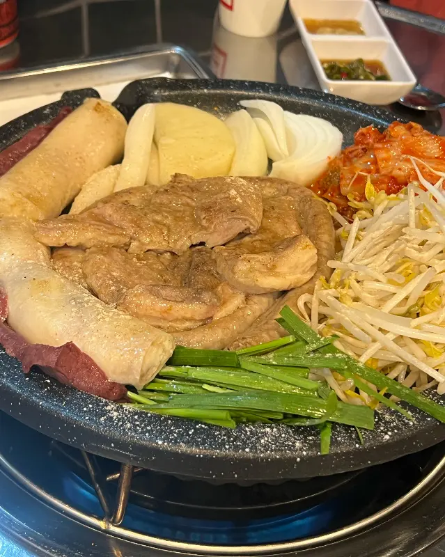 가장 먼저 눈에 띈 것은, 뜨끈한 콩나물국이었다. 쌀쌀한 날씨에 얼었던 몸을 녹여주는 듯, 시원하고 칼칼한 국물 맛이 일품이었다. 곱창과 함께 구워 먹으면 환상적인 조합을 자랑하는 김치와 부추, 숙주도 푸짐하게 담겨 나왔다. 특히, 신선한 천엽과 간은 기름장에 살짝 찍어 먹으니 입안에서 살살 녹는 듯했다.