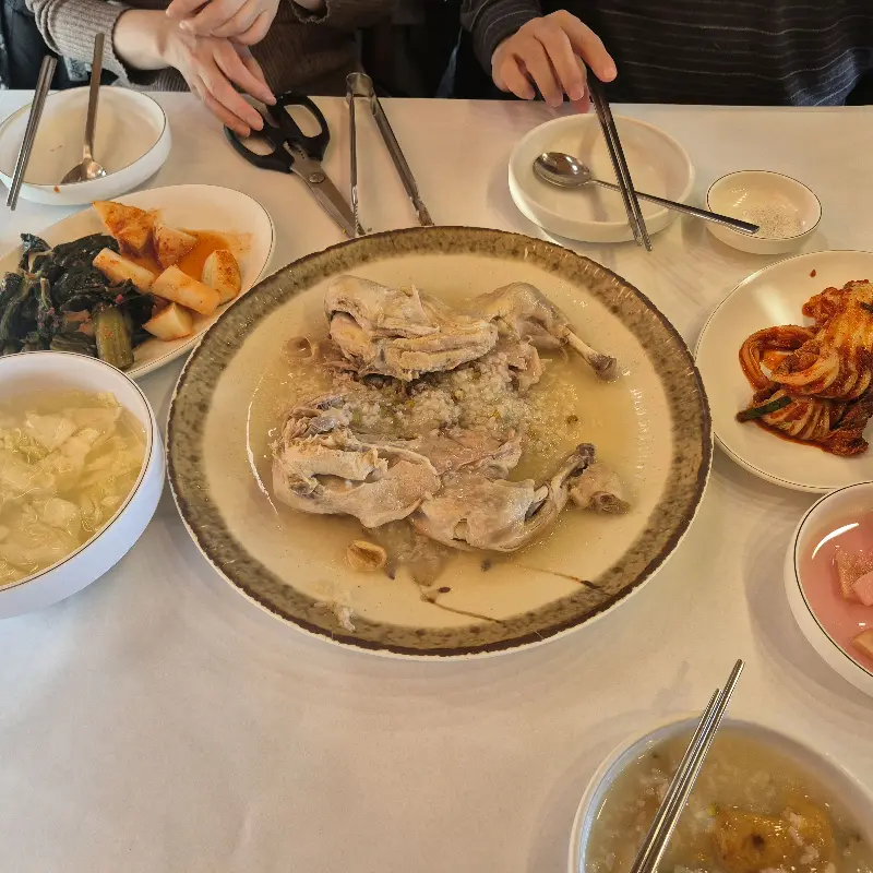 자리에 앉자마자 메뉴판을 펼쳐 들었다. 고민할 것도 없이 누룽지 닭백숙을 주문했다. 예전에 오리백숙도 맛보았지만, 닭백숙 특유의 담백함과 쫄깃함이 더 끌렸기 때문이다. 잠시 후, 정갈하게 차려진 밑반찬들이 식탁을 채웠다. 갓 지은 듯 윤기가 흐르는 겉절이 김치, 시원하고 아삭한 깍두기, 그리고 톡 쏘는 맛이 일품인 갓김치까지. 하나하나 정성이 느껴지는 맛깔스러운 반찬들이었다. 특히 갓김치는 예전 스무살 시절부터 변함없이 맛이 좋았다. 어머님을 모시고 온 손님도 갓김치를 맛있게 드셨다는 후기가 있을 정도니, 그 맛은 보장된 셈이다.