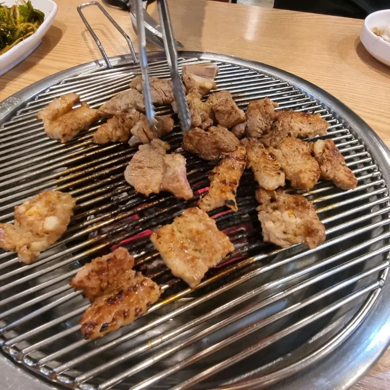 가장 먼저 맛본 메뉴는 숯불 돼지갈비입니다. 윤기가 자르르 흐르는 돼지갈비가 숯불 위에 올려지는 순간, 치익- 하는 소리와 함께 맛있는 냄새가 코를 자극했습니다. 돼지갈비는 너무 달지도 짜지도 않은, 딱 적당한 간이었습니다. 고기 자체의 질도 좋아서 씹을수록 고소한 육즙이 입안 가득 퍼졌습니다. 특히 숯불 향이 은은하게 배어 나와 풍미를 더했습니다.