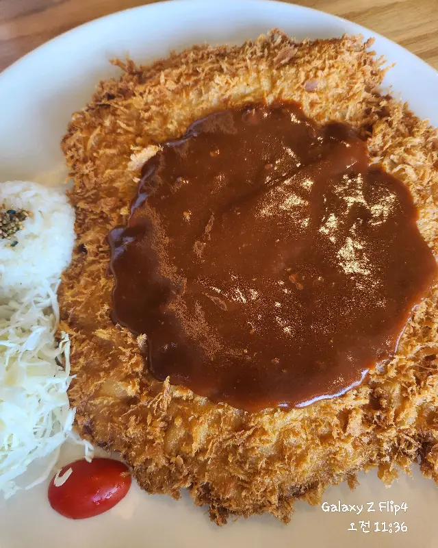 고민 끝에 안심까스와 불고기 볶음밥을 주문했다. 잠시 후, 거대한 크기를 자랑하는 돈까스가 등장했다. 을 보면 알겠지만, 접시를 가득 채운 돈까스의 위용은 실로 대단했다. 얇고 바삭한 튀김옷은 황금빛 갈색을 띠고 있었는데, 이는 마이야르 반응이 성공적으로 일어났음을 시각적으로 증명하는 증거였다. 젓가락으로 살짝 건드려보니, ‘바삭’하는 경쾌한 소리가 청각을 자극했다. 이 소리는 튀김옷 내부의 수분이 증발하면서 만들어내는 일종의 ‘기포음’으로, 훌륭한 돈까스의 필수 조건 중 하나다.