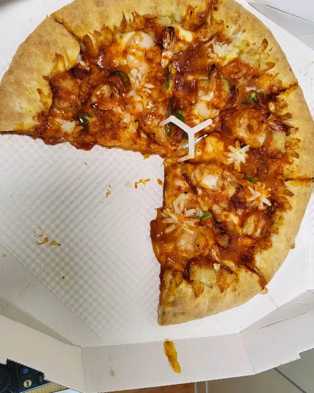 먼저 랍스터 슈림프 투움바 피자 한 조각을 집어 들었다. 쫄깃한 도우 위에 듬뿍 올려진 투움바 소스의 향이 코를 간지럽혔다. 한 입 베어 무니, 입 안 가득 퍼지는 풍부한 해산물의 풍미! 랍스터의 탱글탱글한 식감과 새우의 고소함이 환상적인 조화를 이루었다. 투움바 소스의 부드러움과 은은한 매콤함은 느끼함 없이 피자를 계속 즐길 수 있게 해주었다.