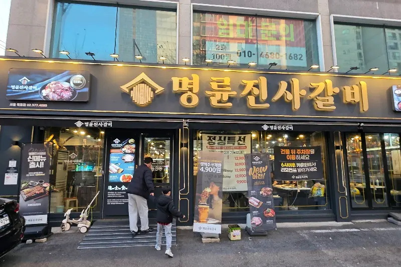 묵동의 밤거리는 퇴근한 직장인들과 학생들로 북적였다. 그 활기 넘치는 풍경 속에서, 유독 밝게 빛나는 간판이 눈에 들어왔다. 황금색 글씨로 쓰인 “명륜진사갈비”는 마치 오래된 친구를 만나는 듯한 반가움을 안겨주었다. 매장 앞에는 이미 몇몇 손님들이 기다리고 있었지만, 넓은 매장 덕분인지 오래 기다리지 않아도 될 것 같았다. 기다리는 동안, 문득 어릴 적 동네 맛집에서 느꼈던 푸근함이 느껴졌다.