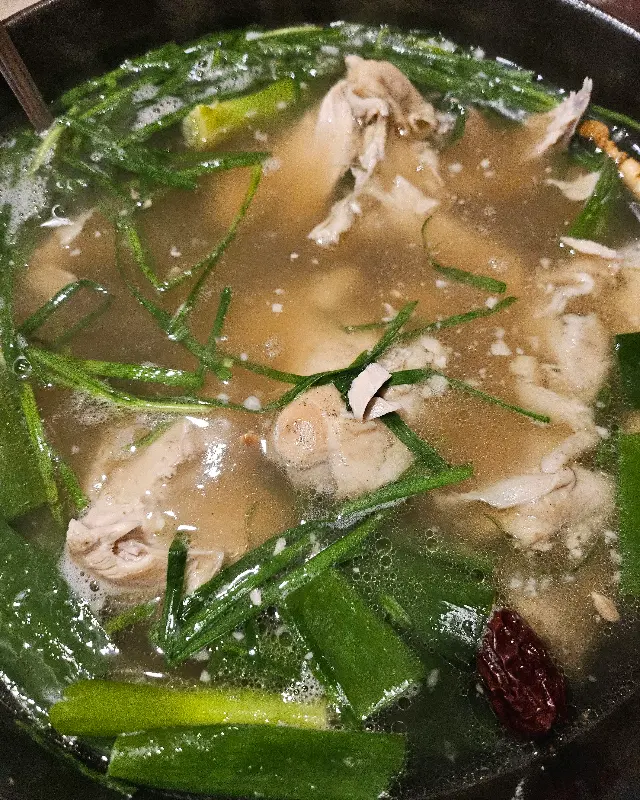 잠시 후, 김이 모락모락 피어오르는 백숙이 등장했다. 뽀얀 국물 위로 큼지막한 닭 한 마리가 푸짐하게 담겨 있었다. 파릇한 채소가 싱그러움을 더하고, 은은하게 풍기는 한약재 향은 입맛을 돋우었다. 국물을 한 입 떠먹으니, 깊고 진한 맛이 온몸을 감쌌다. 닭고기는 야들야들하고 부드러워 입안에서 살살 녹았다. 간이 적절하게 배어 있어, 따로 소금을 찍을 필요도 없었다. 혹시 짜다고 느껴진다면 육수를 추가하면 된다는 친절한 안내도 잊지 않으셨다.