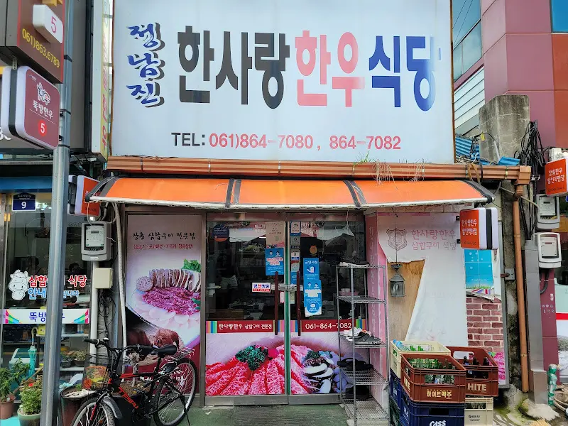 보성 도착! 네비게이션이 가리키는 곳으로 차를 몰았다. 드디어 모습을 드러낸 한사랑한우식당! 멀리서 봐도 딱 느껴지는 포스. 간판에는 큼지막하게 “한사랑 한우식당”이라고 적혀있고, 그 아래 전화번호가 눈에 띈다. 커다란 글씨로 적힌 ‘한사랑 한우식당’ 간판만 봐도 이미 맛집 인증이다. 가게 앞에는 싱싱한 고기 사진이 붙어있어 침샘을 자극한다.