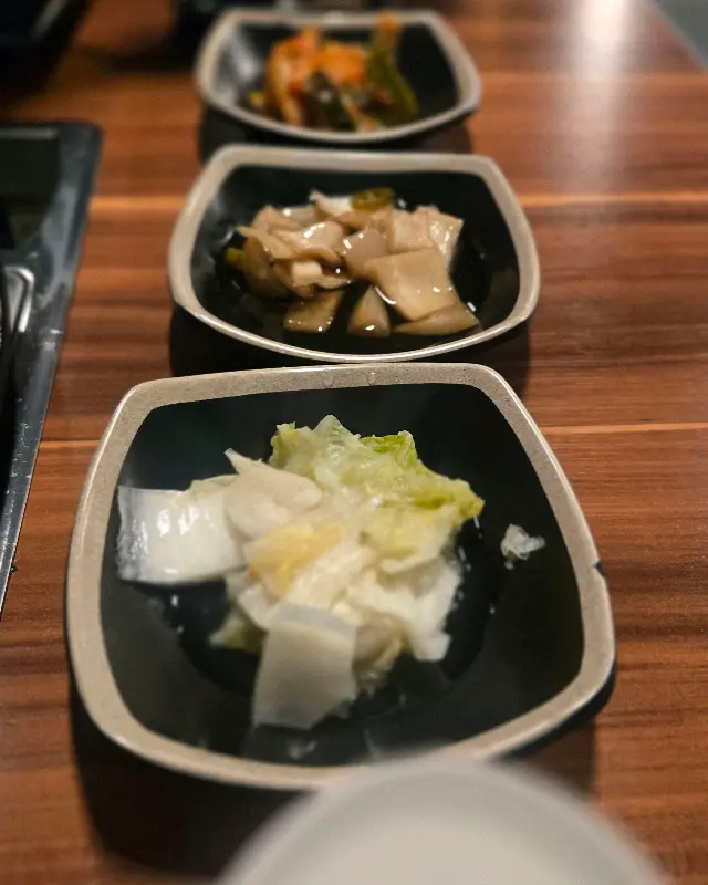 가게 문을 열고 들어서자, 은은하게 퍼지는 고소한 곱창 냄새가 후각을 자극하며 식욕을 돋우었다. 넓고 깔끔한 매장 내부는 테이블 간 간격도 넉넉해서 편안하게 식사를 즐길 수 있는 분위기였다. 테이블 위에는 이미 숯불이 놓여 있었고, 곧이어 정갈하게 담긴 밑반찬들이 하나둘씩 차려졌다. 콩나물김치국은 칼칼하면서도 시원한 맛이 일품이었고, 곱창과 환상적인 궁합을 자랑하는 부추 겉절이도 신선하고 맛있었다. 짭조름한 간장 양념에 졸여진 깻잎 장아찌는 독특한 풍미로 입맛을 돋우어 주었다. 밑반찬 하나하나에서 느껴지는 정성에 감탄하며, 메인 메뉴에 대한 기대감이 더욱 커져갔다.
