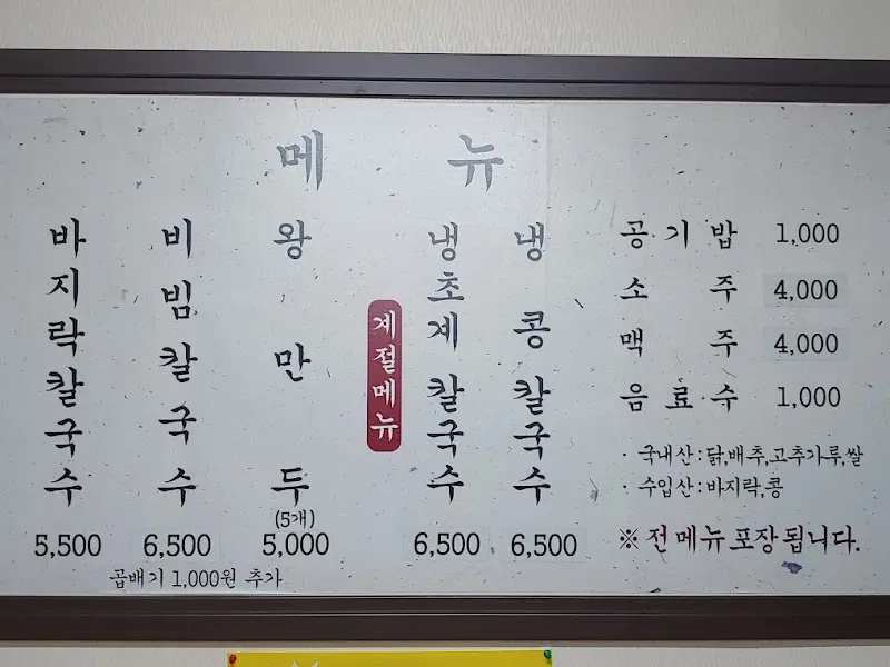 가장 큰 장점은 역시 착한 가격이다. 닭칼국수, 바지락칼국수는 5,500원, 초계칼국수와 콩칼국수는 6,500원이라는 저렴한 가격에 푸짐한 양의 칼국수를 즐길 수 있다. 곱빼기를 추가해도 1,000원밖에 하지 않으니, 학생들에게는 더할 나위 없이 좋은 선택이다. 왕만두 역시 5개에 5,000원으로, 부담 없이 즐길 수 있다.