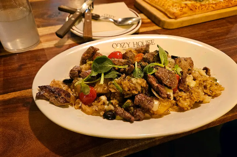마지막으로 주문한 메뉴는 큐브스테이크 필라프였습니다. 코지하우스를 방문할 때마다 항상 주문하는 저의 최애 메뉴입니다. 큐브 모양으로 썰어진 스테이크가 듬뿍 올라가 있고, 특제 소스로 맛을 낸 필라프는 정말 환상적인 조화를 이룹니다. 스테이크는 부드럽고 육즙이 풍부했으며, 필라프는 짭짤하면서도 고소한 맛이 일품이었습니다. 특히, 밥알 하나하나에 소스가 잘 배어들어 씹을 때마다 풍미가 느껴졌습니다. 양도 푸짐해서, 혼자서 다 먹기 힘들 정도였습니다.