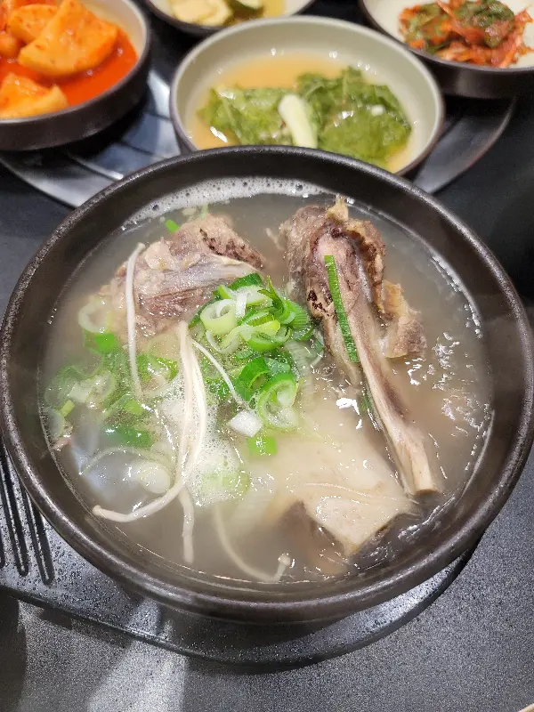 주문 후, 얼마 지나지 않아 왕갈비탕이 나왔다. 뚝배기 안에는 큼지막한 갈비 두 대가 떡하니 자리 잡고 있었고, 팽이버섯과 송송 썰린 파가 보기 좋게 올려져 있었다. 국물은 뽀얀 빛깔을 띠고 있었는데, 보기만 해도 속이 따뜻해지는 느낌이었다. 함께 나온 반찬들도 정갈했다. 깍두기, 김치, 나물 등 다양한 종류의 반찬들이 하나같이 다 맛있어 보였다. 특히, 깍두기는 적당히 익어서 아삭아삭한 식감이 일품이었다.