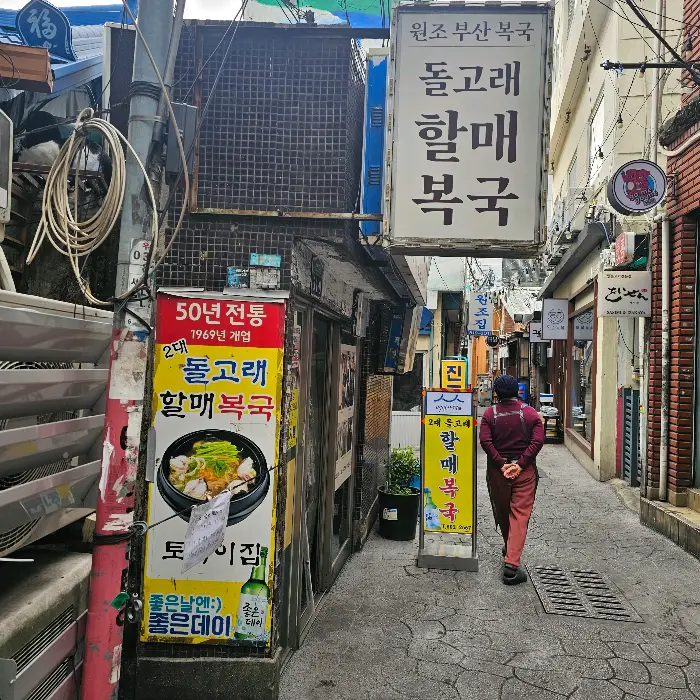 부산의 정겨운 골목길에 자리한 돌고래할매복국 간판이 눈에 띄었어요.