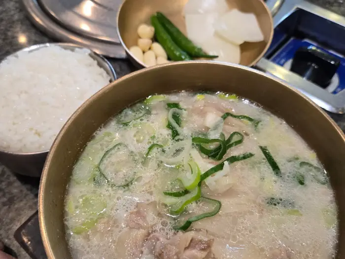 놋그릇에 담긴 돼지국밥과 밥, 곁들임 찬
