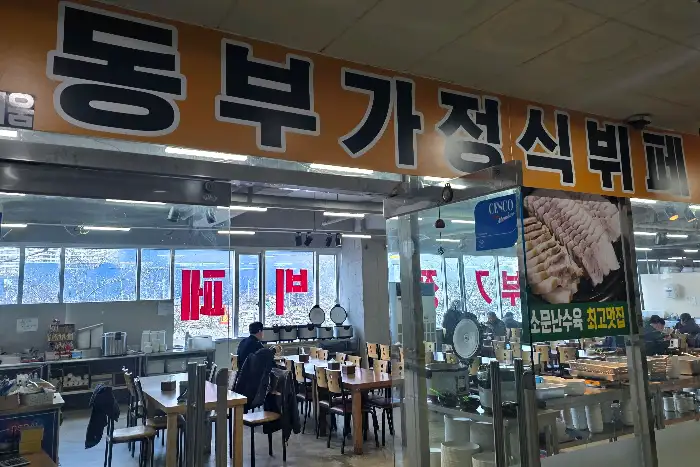 처음 가게에 들어서면 ‘동부 가정식백반뷔페’라고 크게 쓰인 간판이 제일 먼저 보여요. 살짝 오래된 듯한 느낌도 들지만, 그만큼 오랜 시간 동안 많은 사람들의 사랑을 받아온 곳이라는 걸 직감했죠. 가게 안은 넓고 테이블도 넉넉하게 배치되어 있어서, 점심시간에 사람이 북적이는 걸 감안해도 자리 걱정은 없겠더라고요. 특히 건설 현장에서 일하시는 분들이 많이 찾는다고 하는데, 그만큼 든든하고 맛있는 한 끼를 보장한다는 증거겠죠?
