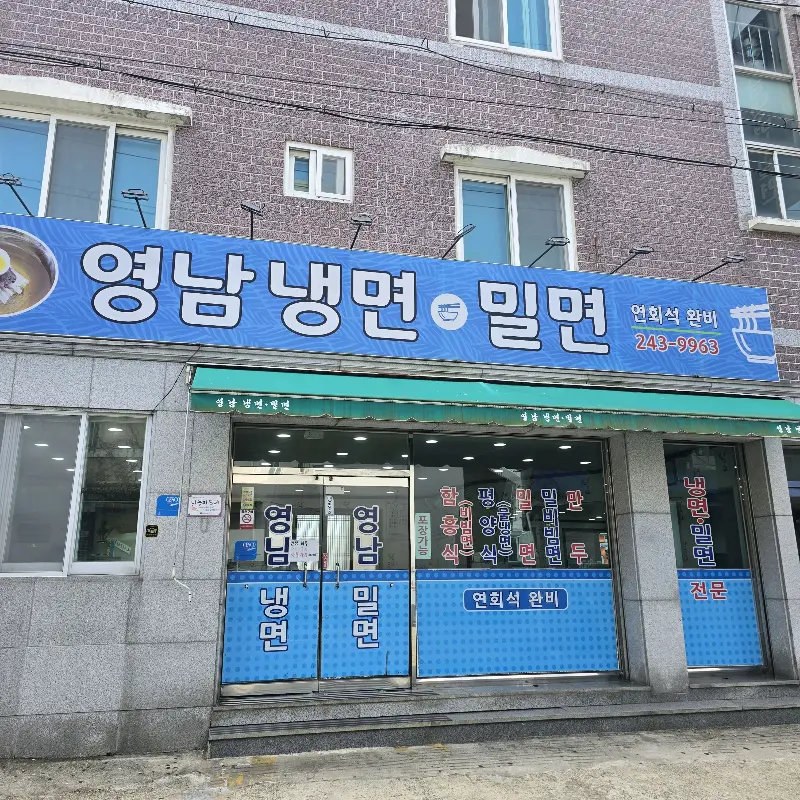 택시에서 내리자마자 눈에 들어온 건, 세월의 흔적이 느껴지는 정겨운 외관! 딱 봐도 ‘나, 찐 맛집이오’ 하는 아우라가 뿜어져 나왔다. 푸른색 간판에 큼지막하게 쓰여진 “영남 냉면•밀면” 글씨가 왠지 모르게 믿음직스러웠다. 자동문을 열고 들어서는 순간, 시원한 냉기가 온몸을 감쌌다. 역시, 여름엔 냉면 아니겠어?