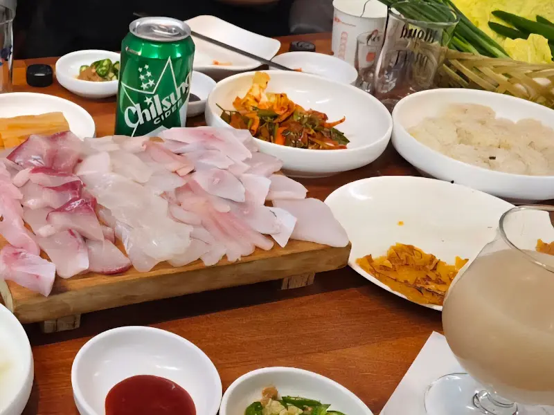 잠시 후, 테이블 위로 믿을 수 없을 만큼 푸짐한 한 상이 차려졌다. 선어회 모듬은 도미, 광어, 농어 등 다양한 종류의 선어로 구성되어 있었는데, 겉보기에도 신선함이 느껴졌다. 뽀얀 속살이 투명하게 빛나는 도미는 입에 넣자마자 사르르 녹아내렸고, 쫄깃한 광어는 씹을수록 고소한 맛이 일품이었다. 특히 인상적이었던 것은 농어였다. 특유의 찰진 식감과 은은한 단맛이 어우러져, 젓가락을 멈출 수 없게 만들었다.