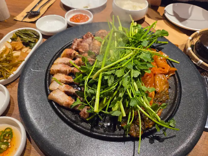 잘 구워진 삼겹살 한 점에 싱그러운 미나리를 얹어 먹는 맛은 그야말로 일품입니다.