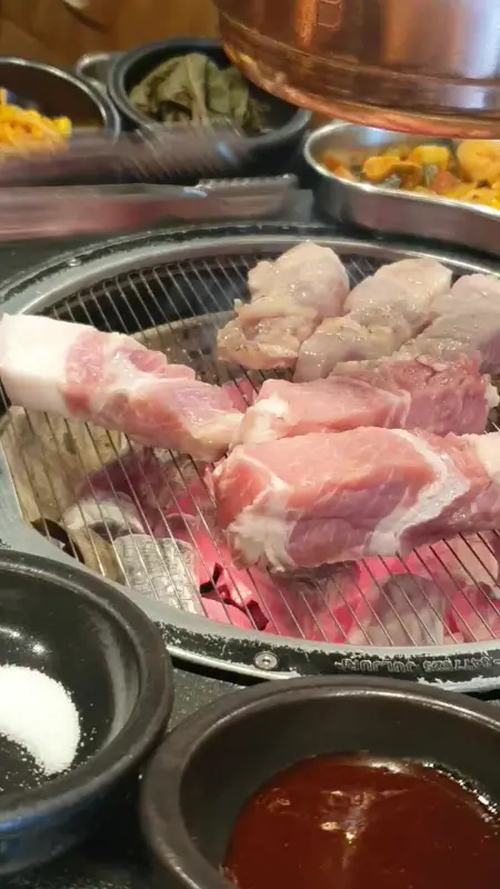 테이블 중앙에는 숯불을 넣는 공간이 마련되어 있고, 그 위에는 환풍기가 설치되어 있습니다. 숯불의 은은한 열기가 훈훈한 분위기를 더해주고, 환풍기는 연기를 빠르게 흡수해서 쾌적한 환경을 유지해 줍니다. 덕분에 고기를 굽는 동안에도 답답함 없이 편안하게 대화를 나눌 수 있었습니다. 테이블마다 다양한 곁들임 찬들이 놓여 있는데, 깔끔하게 정돈된 모습이 인상적이었습니다. 콩나물, 김치, 쌈 채소 등 다채로운 찬들은 고기의 맛을 더욱 풍성하게 만들어 줍니다. 특히 저는 대파김치를 생으로 먹는 게 정말 맛있었습니다.
