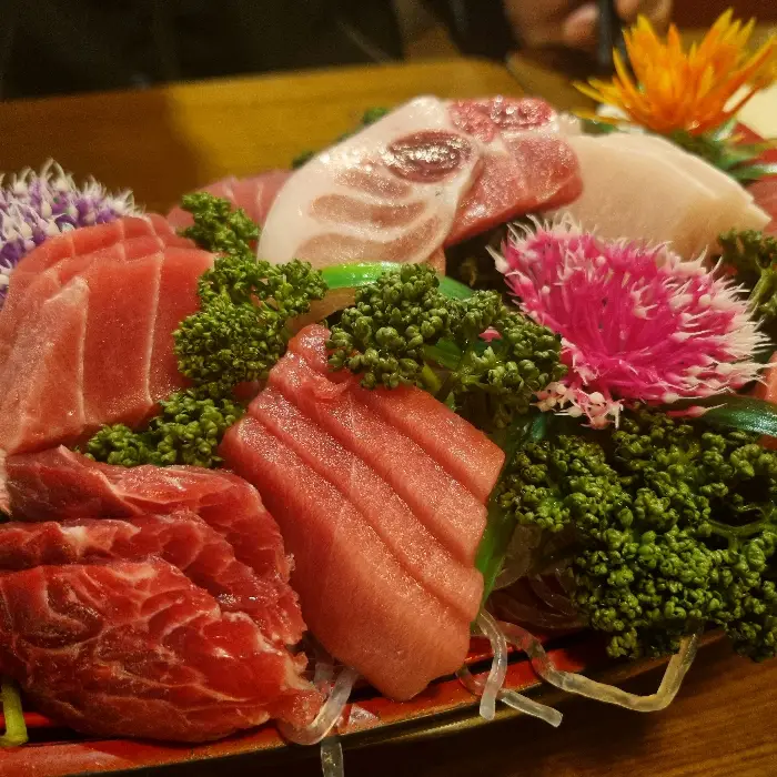 잠시 후, 주문한 메뉴가 등장했습니다. 먼저 나온 것은 ‘모듬회 3종’이었습니다. 플레이팅부터가 범상치 않았습니다. 싱싱한 채소와 색색의 꽃 장식으로 화려하게 꾸며진 접시는 마치 예술 작품 같았습니다. 빨갛게 물든 참치, 연분홍빛의 광어, 그리고 하얗고 투명한 흰살 생선까지. 세 가지 생선이 각자의 매력을 뽐내며 자태를 드러냈습니다. 얇게 썰어낸 회 위로 맺힌 물방울은 신선함을 그대로 보여주는 듯했습니다.