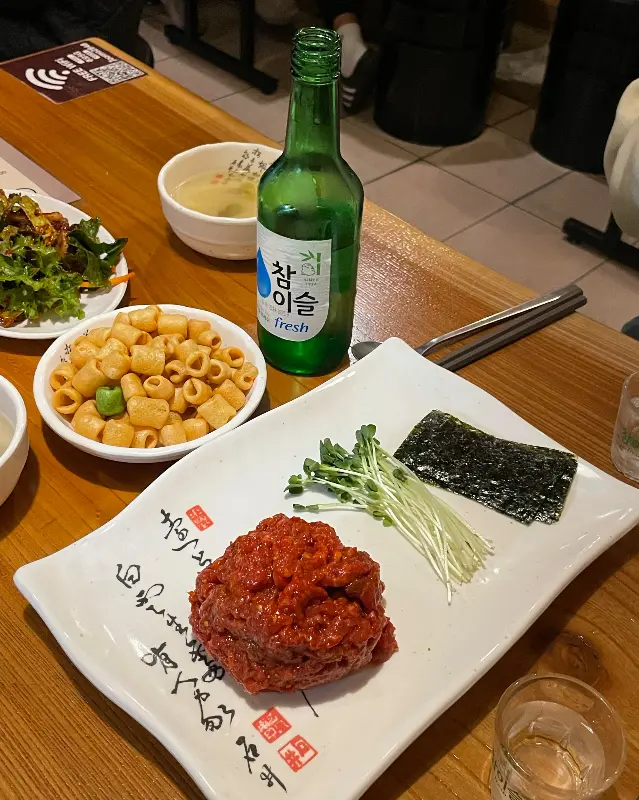 이윽고 기다리던 ‘걸 세트’가 나왔다. 윤기가 좌르르 흐르는 육회와 촉촉해 보이는 보쌈의 비주얼은 감탄을 자아내기에 충분했다. 육회는 신선한 한우를 사용해서인지, 입에 넣는 순간 사르르 녹아내리는 듯했다. 적당히 매콤하면서도 달콤한 양념은 육회의 풍미를 한층 더 끌어올렸다. 특히, 김에 싸서 먹으니 고소한 맛까지 더해져 더욱 맛있었다. 사진에서 볼 수 있듯이, 육회 위에는 싹이 튼 채소와 김이 함께 제공되어 다채로운 맛과 식감을 즐길 수 있었다.