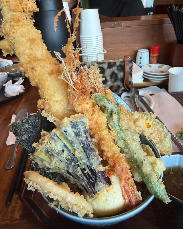 드디어 ‘스페셜 텐동’이 눈앞에 등장했다. 뚜껑을 열자마자 탄성이 절로 나왔다. 큼지막한 장어 한 마리가 통째로 튀겨져 밥 위에 얹혀 있었고, 새우, 가지, 단호박, 꽈리고추, 김 등 다양한 튀김들이 탑처럼 쌓여 있었다. 그야말로 ‘비주얼 폭발’이라는 표현이 딱 들어맞았다. 튀김옷은 눈으로 보기에도 바삭함이 느껴질 정도로 섬세하게 튀겨져 있었다. 튀김 표면의 불규칙한 형태는 기름과 튀김옷이 만나 만들어낸 예술 작품 같았다.