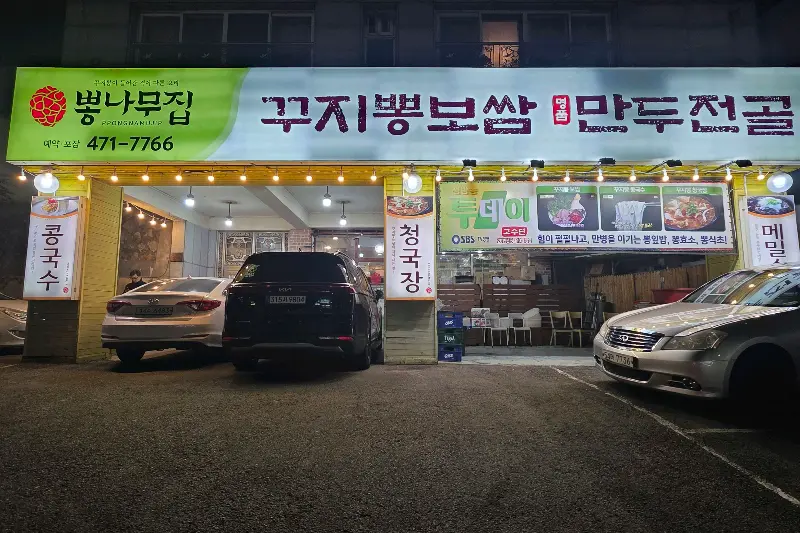 가게 앞에 도착하니까 생각보다 훨씬 크고 깔끔한 외관이 눈에 띄었어. 커다란 간판에 “뽕나무집”이라고 큼지막하게 쓰여있고, 그 옆에 “꾸지뽕보쌈만두전골”이라고 적혀있는 걸 보니, 여기 대표 메뉴가 보쌈이랑 만두전골인가 보더라고. 딱 봐도 맛집 포스 좔좔 흐르는 게, 오늘 제대로 먹겠구나 싶었지. 을 보면 알겠지만, 저녁시간이라 그런지 은은한 조명이 가게를 비추고 있어서 분위기도 꽤 괜찮았어. 얼른 안으로 들어가 볼까?