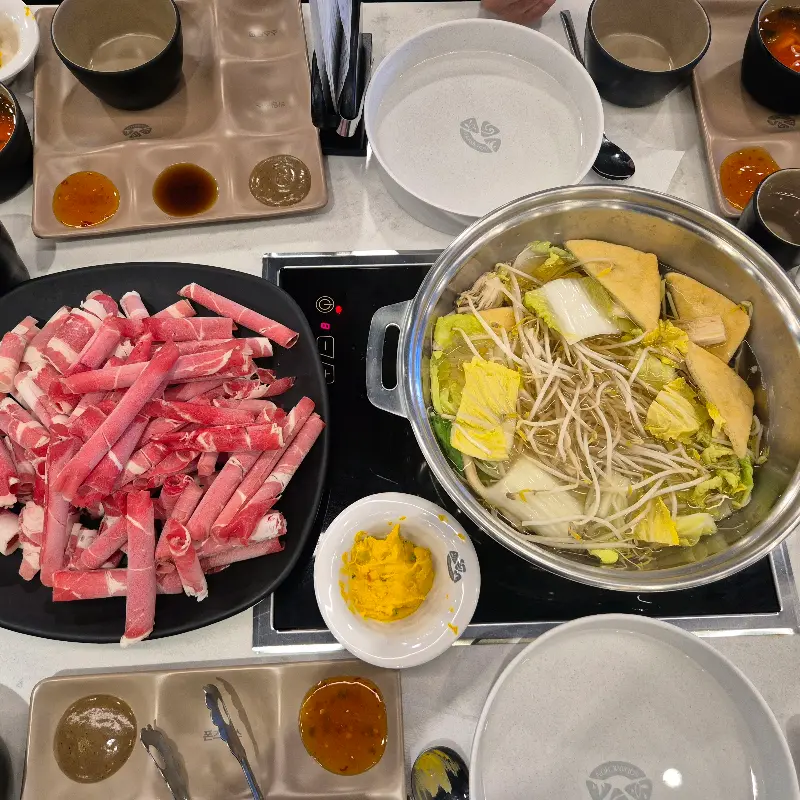육수는 맑은 육수와 매콤한 육수 두 가지를 선택할 수 있는 반반 육수로 주문했다. 맑은 육수는 담백하고 깔끔한 맛이 일품이었고, 매콤한 육수는 칼칼하면서도 깊은 맛이 나서 질릴 틈 없이 번갈아 즐길 수 있었다. 특히 매운맛을 좋아하는 나에게는 매콤한 육수가 아주 만족스러웠다.