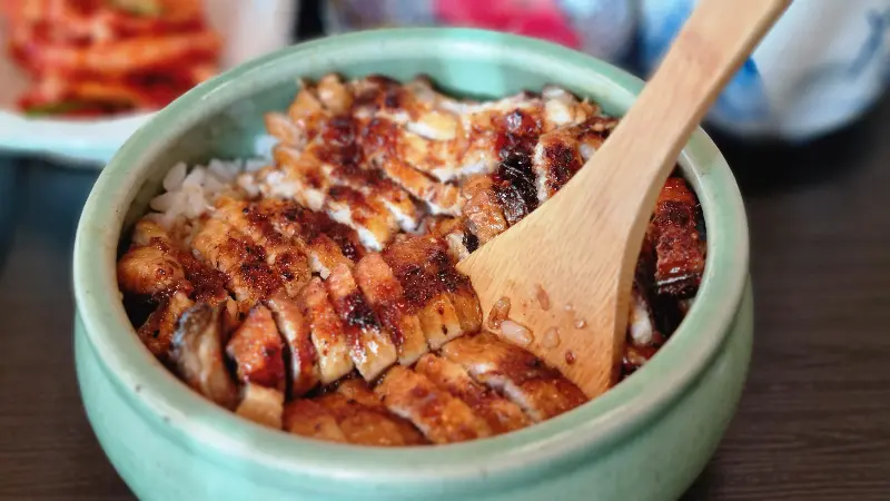 윤기가 좌르르 흐르는 장어덮밥 비주얼! 숯불 향이 코를 찌르네.