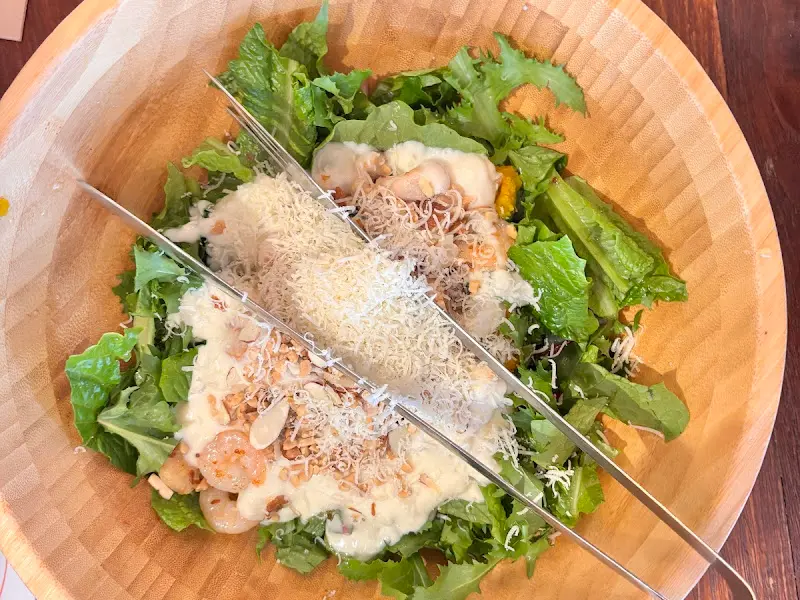 가장 먼저 눈에 들어온 것은 샐러드 볼이었다. 커다란 나무 볼에 싱싱한 채소가 가득 담겨 있었고, 그 위에는 새우와 치즈가 듬뿍 뿌려져 있었다. 샐러드용 집게가 함께 놓여 있어, 각자 먹을 만큼 덜어 먹을 수 있었다. 샐러드를 한 입 맛보니, 신선한 채소의 아삭함과 새우의 탱글함이 어우러져 입안 가득 행복을 선사했다. 특히 차가운 샐러드에 따뜻한 새우의 조화는 신선한 경험이었다.