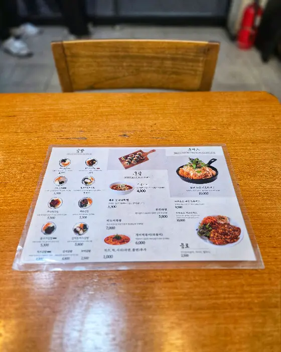 개미김밥의 내부는 20년 넘는 세월의 흔적이 느껴지면서도 깔끔하게 관리되어 있었습니다. 나무 테이블과 의자는 편안한 분위기를 더해주었고, 조명 또한 너무 밝지도 어둡지도 않아 안정감을 주었습니다.