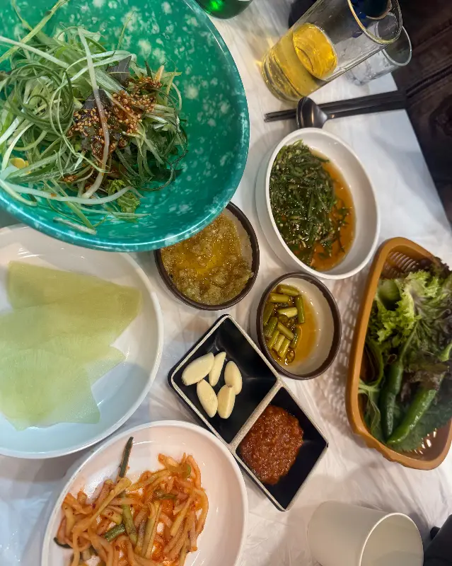 주문을 마치자마자 밑반찬이 쫙 깔렸는데, 진짜 하나하나 정성이 느껴지더라. 특히 묵은지, 콩나물, 파절이 같은 고기 친구들이 푸짐하게 나와서 완전 만족! 쌈 채소도 얼마나 싱싱한지, 쌈 싸 먹을 생각에 벌써부터 입에 침이 고이기 시작했어. 곁들임 소스도 다양하게 준비되어 있었는데, 특히 마늘기름장이랑 고추채장이 특이하더라. 사장님의 센스가 돋보이는 부분이었지.