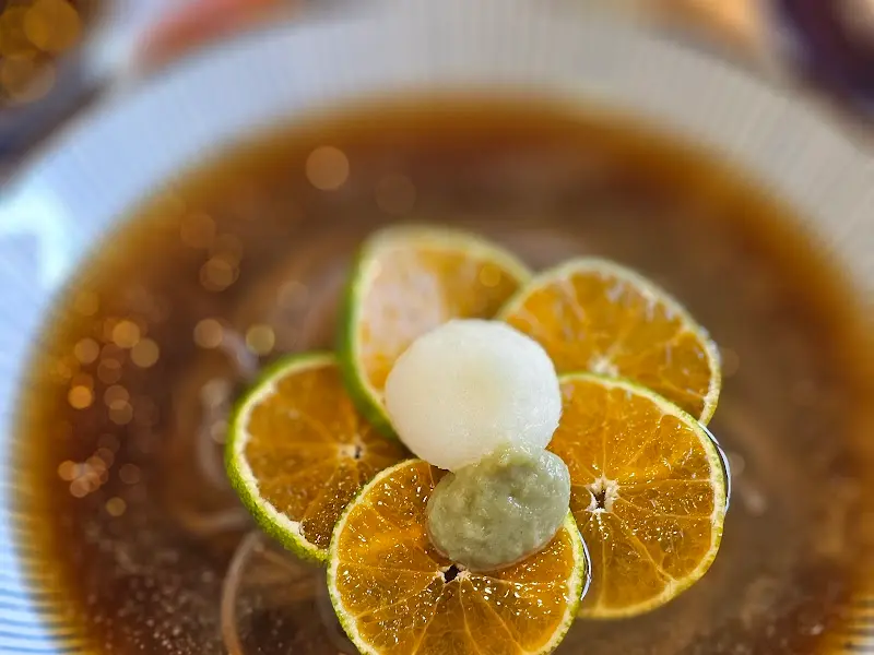 드디어 기다리고 기다리던 청귤소바가 나왔어요. 뽀얀 면 위에 슬라이스 된 청귤이 동동 떠 있는 모습이 얼마나 예쁜지 몰라요. 마치 겨울에 눈이 소복이 쌓인 풍경 같기도 하고, 싱그러운 여름날의 햇살 같기도 하고. 쯔유 국물은 또 얼마나 맑은지, 보기만 해도 입안에 침이 고이더라구요. 얼른 젓가락을 들어 면과 청귤을 함께 집어 후루룩 먹어보니… 아이고, 이 맛은 정말 말로 다 표현할 수가 없어요.