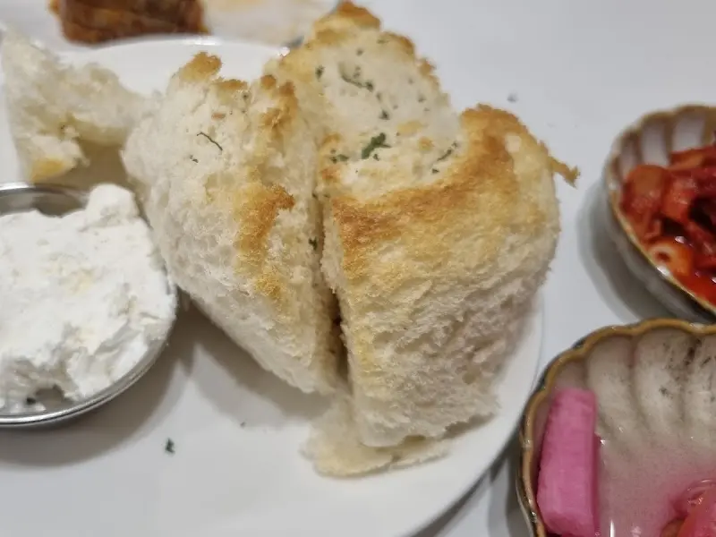 첫 번째 실험 대상은 바로 식전빵이었습니다. 겉은 바삭하고 속은 촉촉한 식감의 완벽한 조화. 빵 표면의 미세한 갈색 크러스트는 160도 이상에서 일어나는 마이야르 반응의 결과물임을 직감할 수 있었습니다. 함께 제공된 크림 치즈는 빵의 따뜻함에 부드럽게 녹아들며, 입 안에서 환상적인 조화를 이루었습니다. 단순한 빵과 치즈의 조합이 아닌, 온도와 질감, 그리고 맛의 과학적인 앙상블이었습니다. 을 보면 빵의 질감이 더욱 생생하게 다가옵니다.