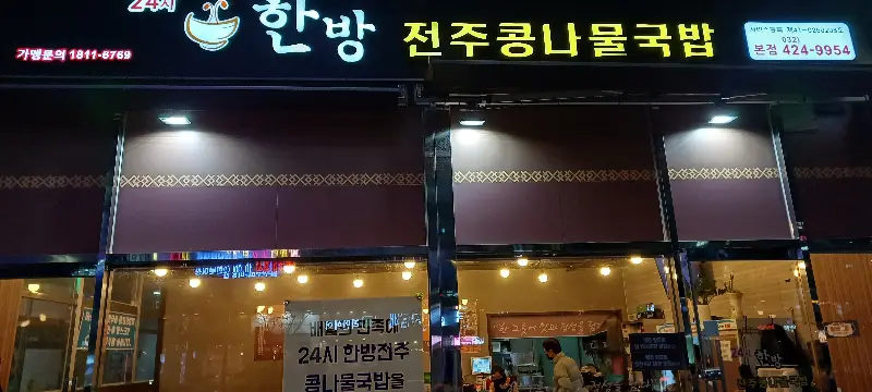 가게 앞에 도착하니, 밝은 네온사인 간판이 어둠을 쫓아내고 있었다. 간판에는 큼지막하게 “24시 한방전주콩나물국밥”이라고 적혀 있었고, 그 옆에는 전화번호와 함께 가맹 문의 번호까지 적혀 있는 것으로 보아 꽤나 유명한 프랜차이즈인 듯했다. 셔터를 반쯤 내린 모습이었지만, 안에서는 여전히 활기가 느껴졌다. 늦은 시간임에도 불구하고 식사를 즐기는 사람들이 꽤 있었다.