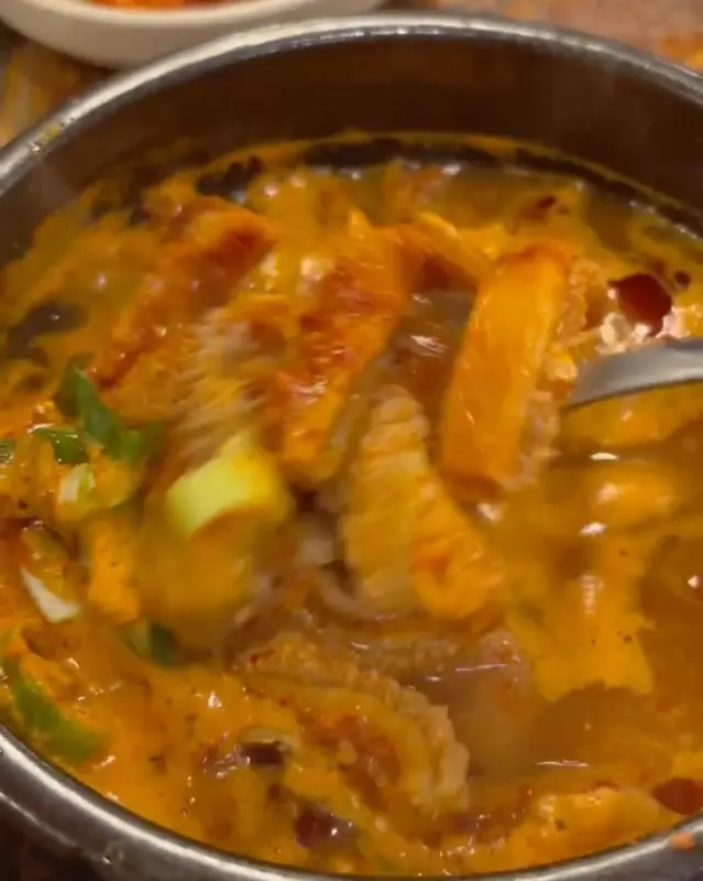 뚝배기 안에는 곱창, 양 등 다양한 내장들이 푸짐하게 들어 있었다. 젓가락으로 건져 올리니, 쫄깃쫄깃한 곱창과 부드러운 양이 먹음직스럽게 모습을 드러냈다. 특히 곱이 가득 찬 곱창은 씹을수록 고소한 맛이 일품이었다.