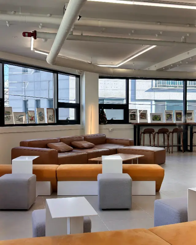 넓은 공간을 더욱 돋보이게 하는 건 바로 감각적인 인테리어였어. 톤 다운된 오렌지 컬러의 푹신한 소파와 테이블, 그리고 곳곳에 놓인 그림과 식물들이 조화롭게 어우러져 편안하면서도 스타일리시한 분위기를 연출하고 있더라. 특히 창가 자리는 햇빛이 잘 들어서 그런지, 다들 인생샷 찍느라 정신없어 보이더라고. 나도 질 수 없지, 바로 자리 잡고 폰 꺼내서 찰칵찰칵!