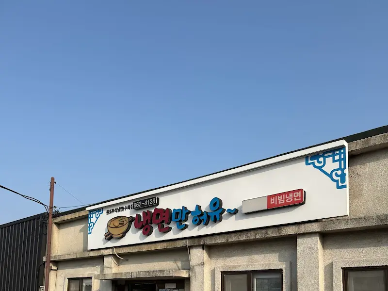 Yo, 오늘 내가 쏜다! 서산 출장길에 냉면 한 그릇 땡기러 ‘만허유’로 출동. 원래 면 덕후 레이더에 걸린 곳인데, 드디어 행차하셨다. 간판부터 범상치 않아. 파란 하늘 아래 떡하니 자리 잡은 “냉면 만허유” 세 글자, 힙합 비트처럼 쿵쾅거리는 기대감을 안고 가게 안으로 Let’s get it!