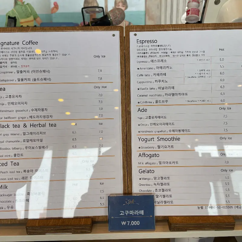 자리를 잡고 메뉴판을 펼쳐 들었습니다. 커피 종류가 다양했는데, 특히 눈길을 끈 것은 ‘일출커피’와 ‘일몰커피’였죠. 카페 이름이 사장님의 성함에서 따온 것을 보니, 커피에 대한 자부심이 대단하신 듯했습니다. 고민 끝에 저녁 시간이었던 터라, 핑크 솔트가 더해진다는 ‘일몰커피’를 주문했습니다. 디저트로는 이곳의 인기 메뉴인 딸기 티라미수를 골랐습니다.