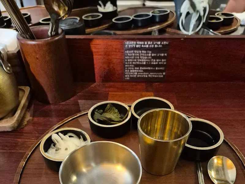 자리에 앉자마자 눈에 들어온 건, 테이블 세팅이었어. 놋그릇에 담긴 깔끔한 반찬들과 반짝이는 수저, 젓가락이 정갈하게 놓여 있었어. 놋으로 된 물컵까지 준비되어 있는 센스! 마치 고급 한정식집에 온 듯한 느낌도 살짝 들더라. 은은하게 빛나는 놋그릇들이 따뜻한 분위기를 더해주는 것 같았어.