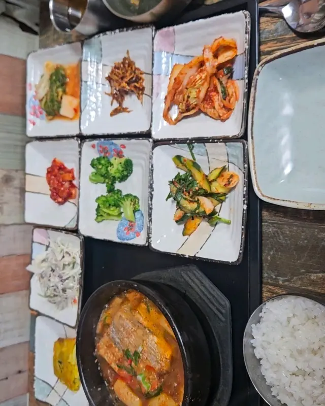 상 위에는 메인 메뉴인 갈치조림과 성게미역국을 비롯해, 다양한 밑반찬들이 푸짐하게 차려져 있었다. 김치, 콩나물무침, 멸치볶음, 톳나물 등 하나하나 정성이 느껴지는 반찬들이었다. 특히 눈길을 끈 것은 8가지나 되는 다채로운 밑반찬이었다.